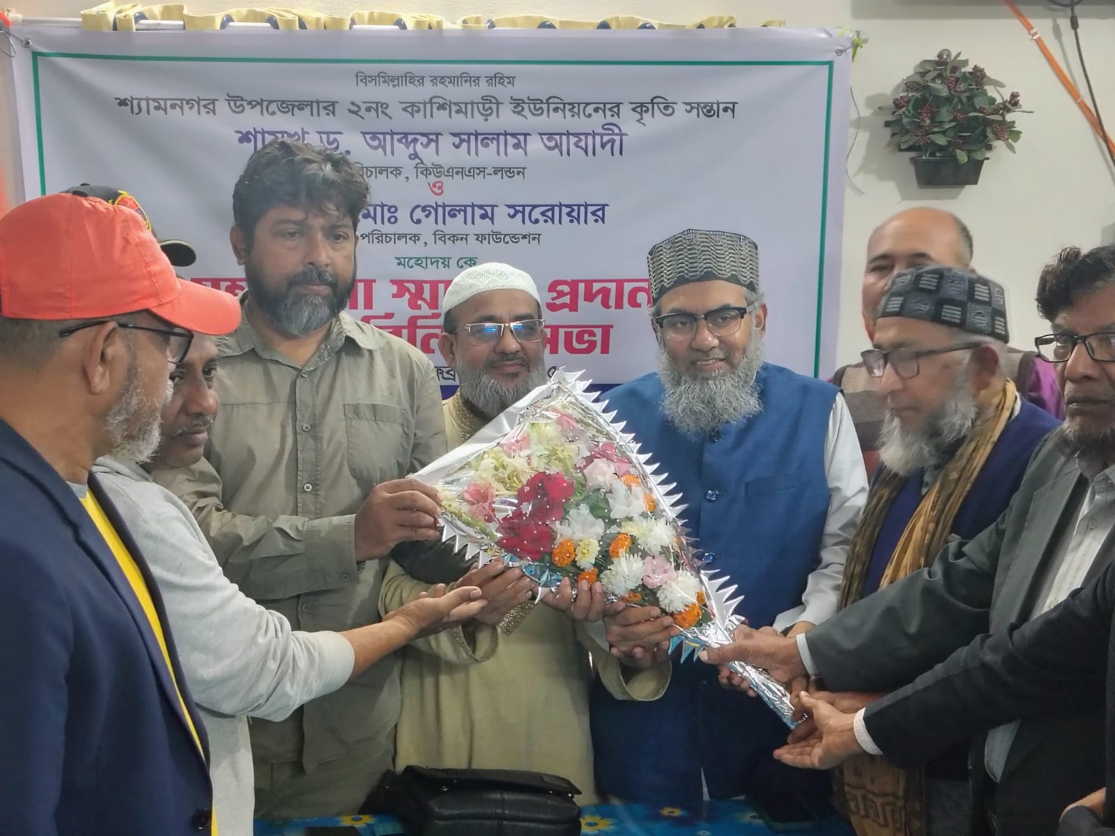 সাতক্ষীরার কৃতি সন্তান কিউএনএস-লন্ডন এর পরিচালক শায়খ ড. আব্দুস সালাম আযাদী বলেন, দেশকে এগিয়ে নিতে হলে রিবিল্ট করতে হবে, কনস্ট্রাকটিভ হতে হবে। আমরা যারা বলছি স্বাধীনতা ২.০ তাদেরকে এটা মাথায় রাখতে হবে। গতানুগতিক ভাবে যদি ডিস্ট্রাক্টটিভ ওয়েতে চলি তাহলে আমরা কিছু করতে পারবো না। বৃহস্পতিবার (৬ই ফেব্রুয়ারি) সকাল ১১ টায় শ্যামনগর উপজেলা প্রেসক্লাবের কনফারেন্স রুমে এক সম্মাননা স্মারক প্রদান ও মতবিনিময় সভা অনুষ্ঠানে প্রধান অতিথির বক্তব্যে তিনি এসব কথা বলেন। তিনি আরোও বলেন, গঠন মূলক, সমালোচনা মূলক এবং উদ্দিপনা মূলক এই তিন ধারার প্রেস জাতিকে জাগ্রত করে, দেশকে এগিয়ে নিতে সাহায্য করে। তিনি আশা প্রকাশ করেন শ্যামনগর উপজেলা প্রেসক্লাব তার দায়িত্ব সঠিকভাবে এবং নিষ্ঠার সাথে পালন করবে।প্রেসক্লাবের সভাপতি সামিউল আজম মনিরের সভাপতিত্বে এবং সেক্রেটারী মোস্তফা কামালের সঞ্চালনায় বিশেষ অতিথির বক্তব্য প্রদান করেন বিকন ফাউন্ডেশন এর পরিচালক মো: গোলাম সারোয়ার এবং সরকারি মহসিন ডিগ্রি কলেজের সাবেক অধ্যক্ষ জি,এম ওসমান গনি।এছাড়া সাংবাদিকের মধ্যে বক্তব্য প্রদান করেন এস, এম গোলাম মোস্তফা, আবু কাওছার, আবু সাইদ প্রমুখ।এসময় আরোও উপস্থিত ছিলেন জাহিদ সুমন, সিদ্দিকুর রহমান, আশিকুর রহমান, আব্দুস সালাম, সাইফুল ইসলাম, মিজানুর রহমান, বকুল, আনোয়ারুল ইসলাম, অনাথ মন্ডল, উৎপল মন্ডল।